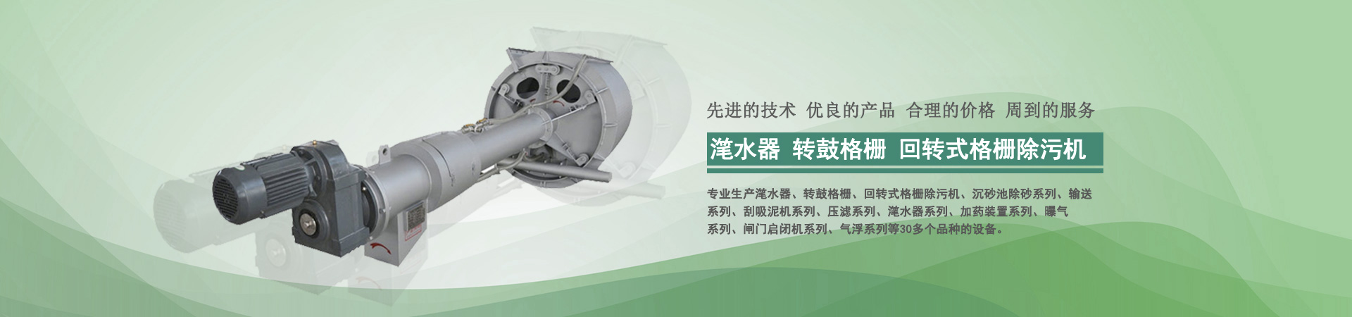 本公司目前專業(yè)生產(chǎn)轉(zhuǎn)鼓式精密過濾器、轉(zhuǎn)鼓格柵、回轉(zhuǎn)式格柵除污機、沉砂池除砂系列、輸送系列、刮吸泥機系列、壓濾系列、潷水器系列、加藥裝置系列、曝氣系列、閘門啟閉機系列、氣浮系列、曝氣器系列、填料系列等30多個品種的設(shè)備...